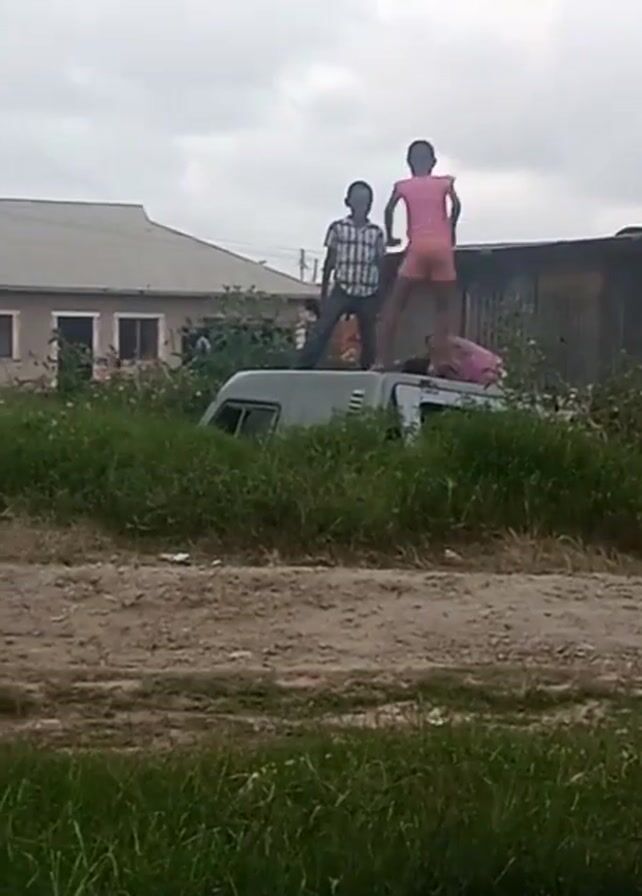 Two children are standing on top of a van in a grassy area. The van is gray and appears to be old. A third child is partially visible behind them on top of the van. The children are silhouetted against a cloudy sky. In the background, there is a house and a corrugated metal structure. The ground is dirt.