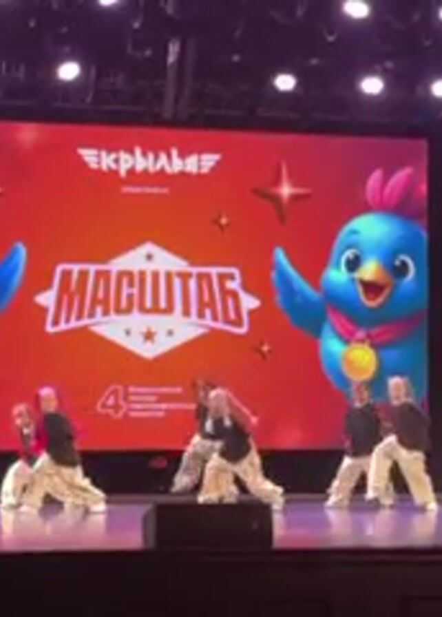 A group of seven children, two boys and five girls, are performing a choreographed dance on a stage. They are wearing black long-sleeved shirts and baggy pants with a camo print. Some of the girls have streaks of pink and purple in their hair. Behind them is a large LED screen displaying a promotional graphic for a festival called "Масштаб" (Scale). The graphic features two cartoon birds, one on each side, with the festival's name in large letters in the center. The stage is set within a grand theater, with ornate details visible in the architecture. The audience can be seen in the foreground, watching the performance. The overall atmosphere is lively and celebratory.