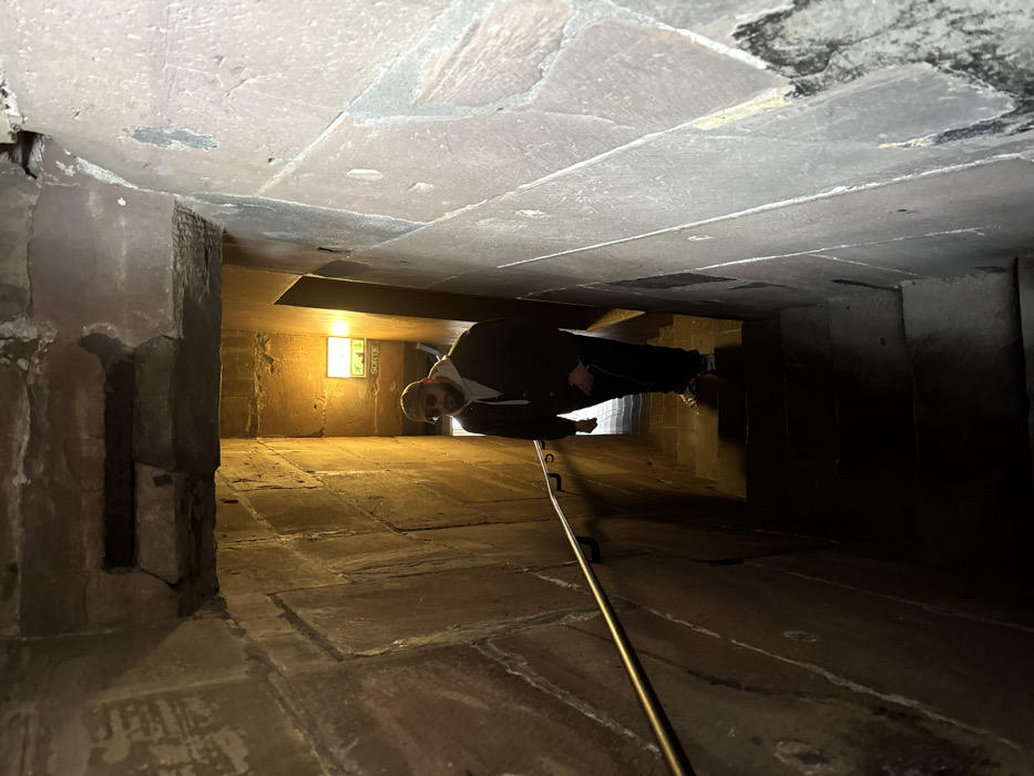 The image depicts a male individual descending a narrow, stone staircase within the tower of the Notre-Dame Cathedral in Strasbourg, France