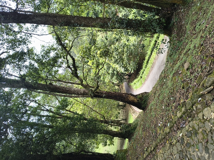A winding asphalt road curves through a lush, green forest. Tall trees line the road, their branches forming a canopy above. A stone wall covered in moss and foliage runs alongside the road on one side. The scene is bathed in natural light, creating a serene and inviting atmosphere. The landscape suggests a peaceful natural area.