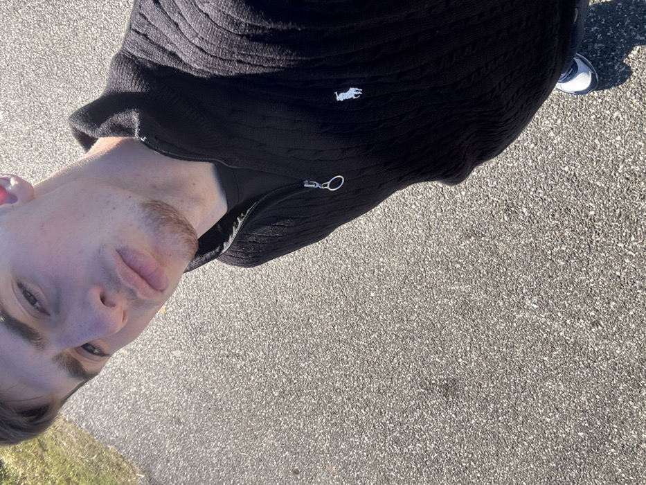 A man stands on asphalt. He wears a black zippered cable knit sweater with a white polo horse logo. He is angled, showing his face and part of his body. A foot in a sneaker is visible.