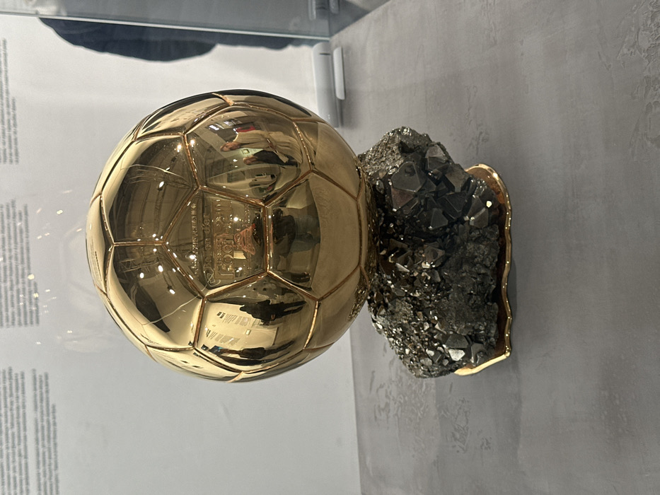A highly polished, spherical gold football trophy, approximately 30-40 cm in diameter, is centrally displayed
