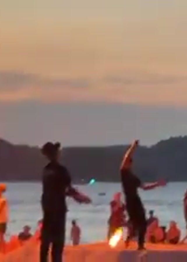 two fire performers on a beach at sunset. The performers, wearing dark clothing and hats, are juggling and tossing flaming objects into the air. A crowd of people is gathered around watching, with some holding burning torches. The beach has several wooden tripod structures with torches at their bases. In the background is a body of water and hills. The sky is a mix of orange, pink, and yellow hues.