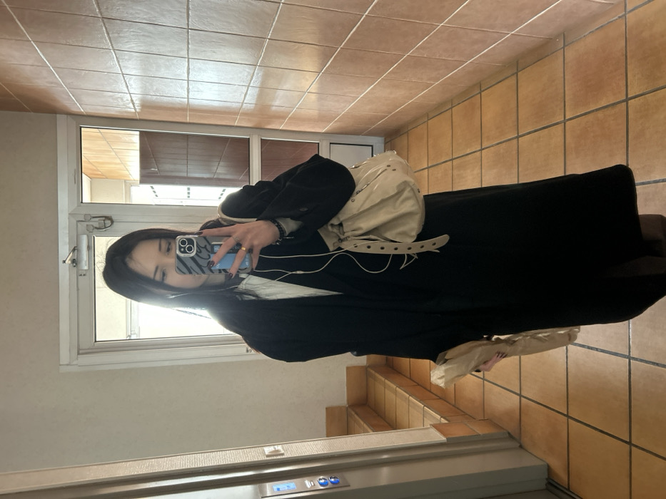 An individual, appearing to be female with long dark hair, captures a mirror selfie in the hallway of a building located in Cachan, France
