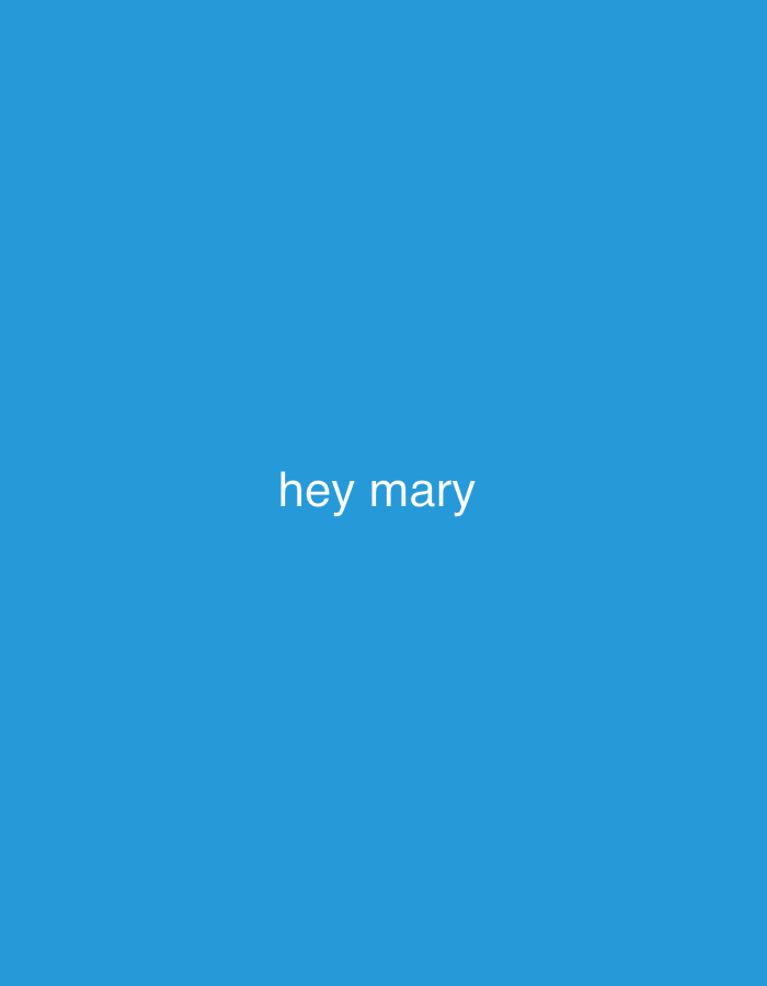 A plain blue background fills the frame. Centered horizontally and vertically, the text "hey mary" appears in a simple, sans-serif font. The text is white. The background blue has a uniform color and tone. The overall image presents a minimalist and straightforward aesthetic.