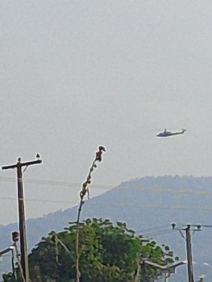 An outdoor, daytime image captures a distant light-colored aircraft with green markings, possibly a turboprop or small plane, in flight across an overcast sky above Zango-ndaji, Nigeria