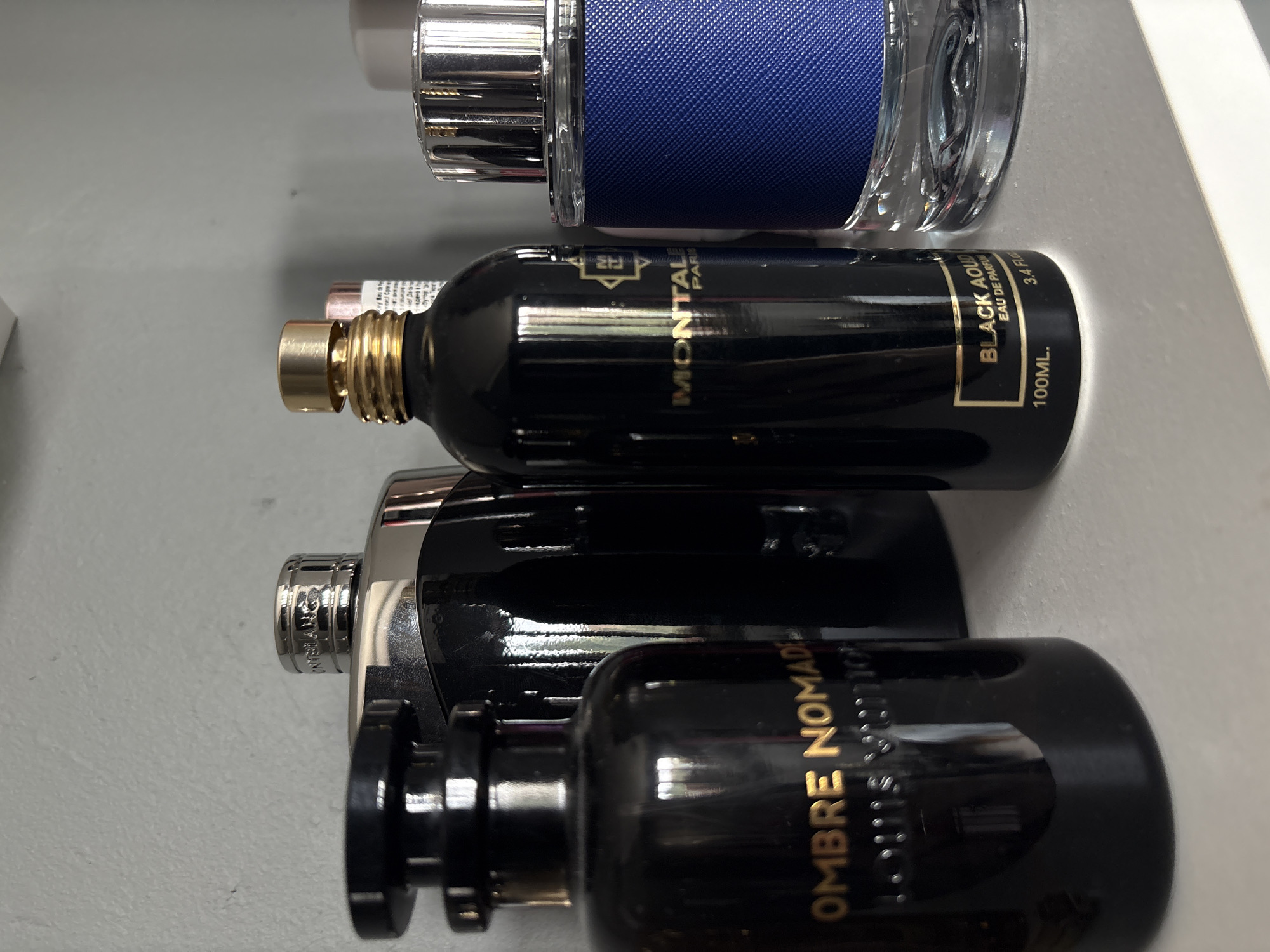 close-up of four perfume bottles arranged in a vertical row on a gray surface. The top bottle is partially visible and has a silver and blue design. Below it is a black bottle labeled "MONTALE PARIS" with a gold top and the text "BLACK AOUD" and "100ML." printed on it. The third bottle is black with a silver top and is partially obscured by the bottle above it. The bottom bottle is black and labeled "OMBRE NOMADE" in gold lettering. The location (Cheshnegirovo, Bulgaria) is not discernible from the image.