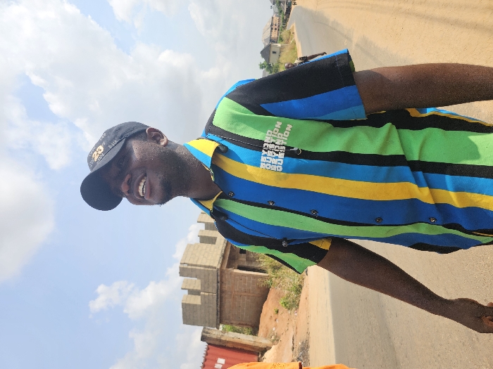 A male individual with dark skin stands on an unpaved road in Ukwu-Abwa, Nigeria, under a sky with scattered white clouds