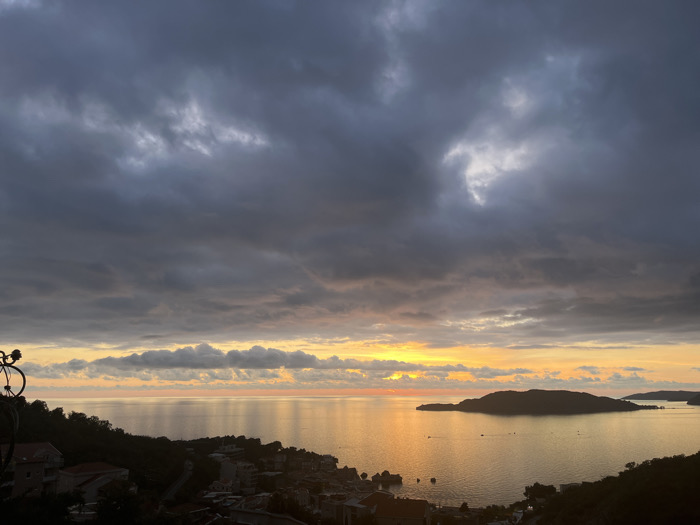 The image captures a panoramic coastal scene over Podličak, Montenegro, observed at either sunrise or sunset. The sky is predominantly overcast with dense, dark grey clouds across the upper and middle portions. A horizontal band of illuminated clouds along the lower sky displays vibrant yellow and orange tones, transitioning to muted reds and greys towards the edges, reflecting the light of an unseen sun positioned near the horizon. The calm water surface below mirrors these sky colors, predominantly golden-orange and grey. In the mid-ground, a prominent, dark, elongated island is silhouetted against the illuminated horizon, with additional smaller landmasses visible further right in the distance. The lower third of the image features a sloping, densely vegetated coastline dotted with multiple residential buildings characterized by light-colored facades and red-tiled roofs. Several small, dark objects, consistent with boats, are scattered across the water. A fragment of a bicycle, specifically a front wheel and handlebars, is partially visible in the extreme upper-left foreground. No human figures or discernible actions are present.
