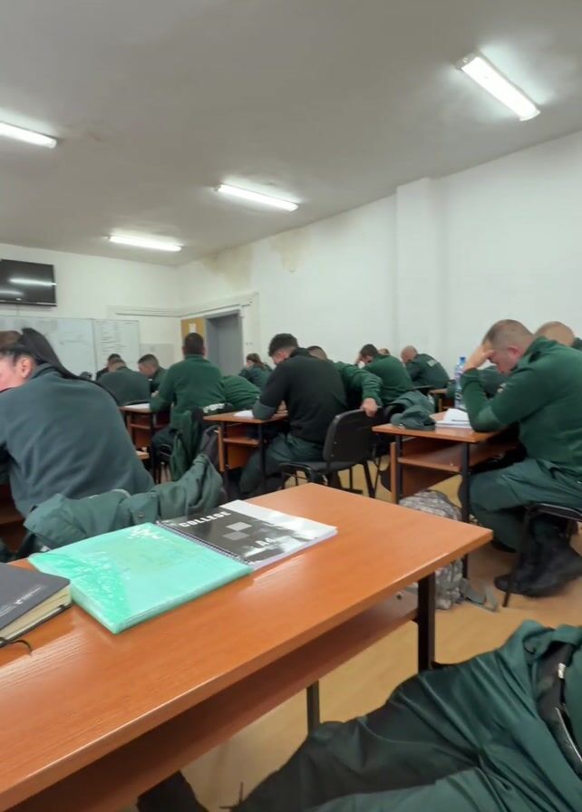 classroom setting with multiple individuals, predominantly males, seated at individual desks. Most are wearing similar green uniforms, and some appear to be resting their heads on their hands or arms on the desks, exhibiting signs of fatigue or boredom. The classroom has wooden desks, simple metal chairs, and fluorescent lighting. The walls are plain and painted white. There are notebooks and other items on the desks. A partially visible tattoo is on the forearm of one of the individuals in the foreground. The general atmosphere appears to be one of a formal training session, possibly for uniformed personnel.