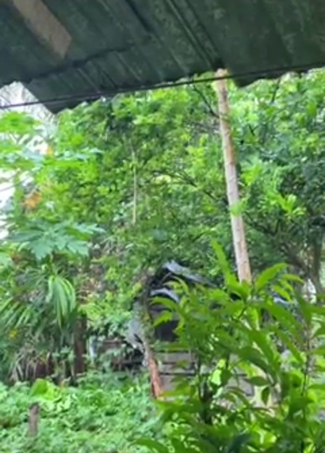 lush, overgrown backyard viewed from under a corrugated metal roof. There are various green plants including a papaya tree, and an old dilapidated wooden structure is partially visible amidst the foliage. It is raining lightly.