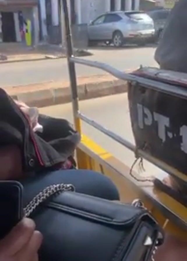 view from inside a yellow three-wheeled vehicle, potentially a tuk-tuk or auto-rickshaw, moving down a street. The focus is on the person seated inside, holding a smartphone in one hand and with a black purse with a silver chain on their lap. Buildings and other vehicles, including another three-wheeled vehicle, pass by outside the vehicle. The weather appears to be sunny.