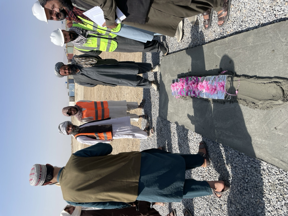 An outdoor, daytime image depicts approximately ten men gathered in a semi-circle around a ceremonial ground-breaking or foundation-laying in Pir Dust, Afghanistan