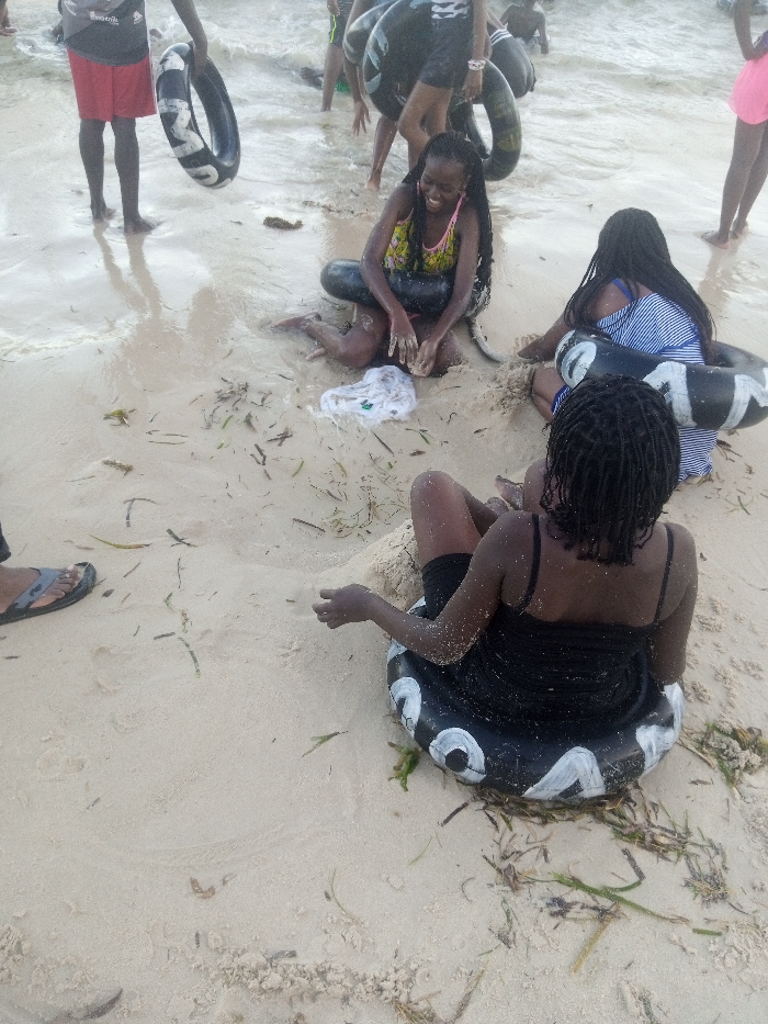 A group of individuals is observed on a sandy beach at Shanzu ward, Kenya, at the edge of shallow ocean water