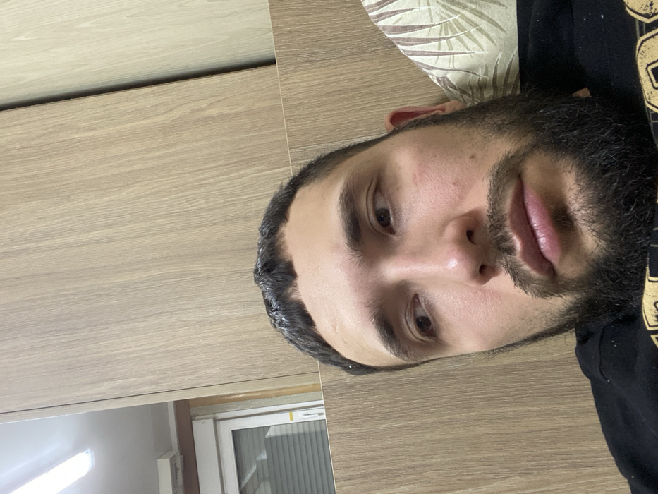 A man with brown eyes and a full, dark beard is shown from the upper chest up, rotated counter-clockwise 90 degrees