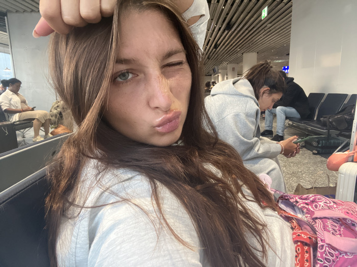 A young woman with long brown hair and fair skin is winking at the camera while puckering her lips. She is wearing a light-colored sweatshirt. Her hand is partially visible at the top of the frame, possibly someone's head behind her. The background shows an airport waiting area with rows of chairs and other passengers sitting or using their phones. A pink and red patterned backpack and a white suitcase are visible near the woman. The lighting appears to be bright and possibly fluorescent.