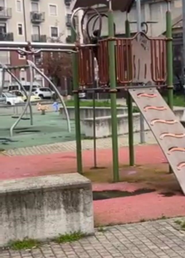 The camera pans around a playground