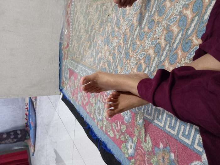 This image depicts an indoor scene in Bulukandang, Indonesia. In the foreground, a person's bare feet are visible, crossed at the ankles, resting on a multi-patterned rug. The individual is wearing dark reddish-purple trousers, covering the legs up to the ankles. The rug displays intricate geometric and floral designs in shades of red, blue, beige, and black. A segment of a plain, light-colored wall is visible on the right side of the frame, extending from the bottom to the top. In the mid-ground, another individual's lower legs and feet are partially visible, wearing dark patterned trousers or a skirt. This second person is standing on a blue prayer mat, which features a white patterned design. The floor beneath and around the prayer mat consists of white square tiles. An additional plain, light-colored wall is visible in the background, behind the second person. A small, translucent plastic object is present on the foreground rug, near the base of the wall on the right.