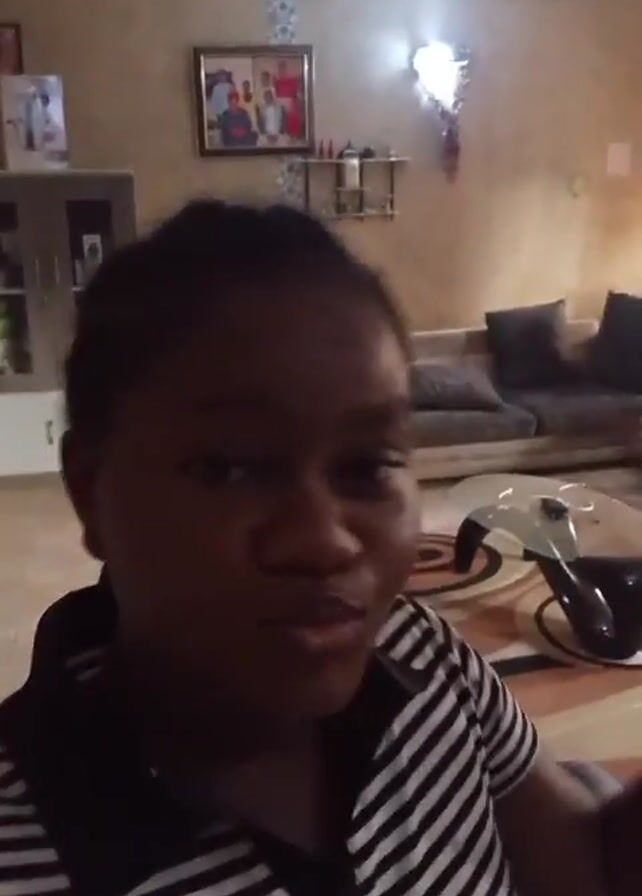 A woman wearing a black and white striped shirt is taking a selfie video inside a room. The room has a tiled floor, a sofa, a coffee table, and a cabinet. There are also pictures hanging on the wall. Music is playing in the background. The woman smiles and speaks, and at one point, makes a kissing face.