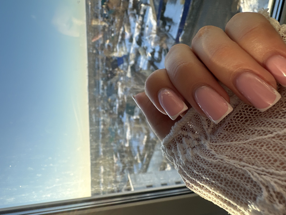 The image depicts a close-up of a person's left hand, adorned with a light-colored, open-weave knitted sleeve, positioned in front of a window. The hand displays manicured nails, shaped in a squoval style with a French manicure featuring a clear or pale pink base and white tips, appearing glossy. Through the window, an elevated view of a snowy cityscape in Chaikovsky, Russia, is visible under a clear, bright blue sky with a low sun casting a warm yellow light from the left. Numerous buildings, some with colored roofs, and bare trees are present in the snow-covered landscape, indicating winter conditions. The windowpane shows minor smudges or reflections.