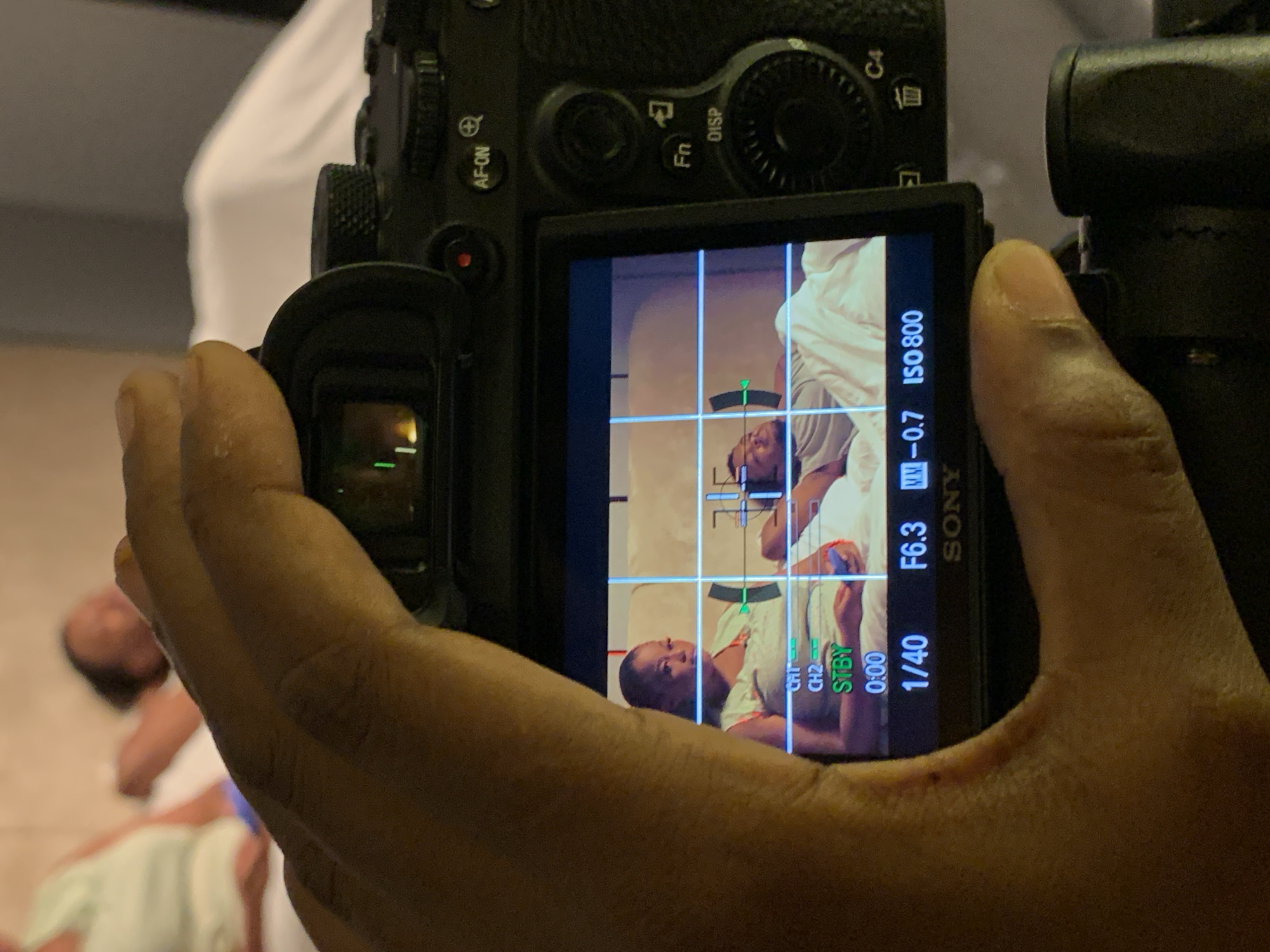 An overhead view depicts a right hand holding a black Sony mirrorless camera, framing a scene on its rear display in the city of Moba, Nigeria. The hand occupies the prominent foreground, partially obscuring the camera's top-right controls and viewfinder. The camera's screen displays a live view or playback, showing two individuals in an indoor setting. On the left, an individual with short hair, wearing a light-colored top, sits upright on a bed, holding a mobile device. On the right, a bearded individual lies down on the same bed, partially covered by white bedding. The screen overlay includes a compositional grid and camera settings: 1/40 shutter speed, F6.3 aperture, -0.7 exposure compensation, and ISO 800, along with "CH1 CH2 STBY 0:00" indicating a video mode. In the blurry background, behind the camera, additional out-of-focus figures and white bedding or furniture are visible, consistent with an indoor environment.