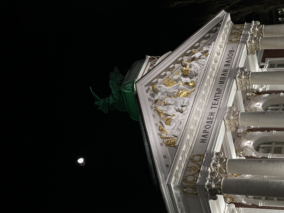 The image displays a low-angle, nighttime view of the Ivan Vazov National Theatre in Sofia, Bulgaria