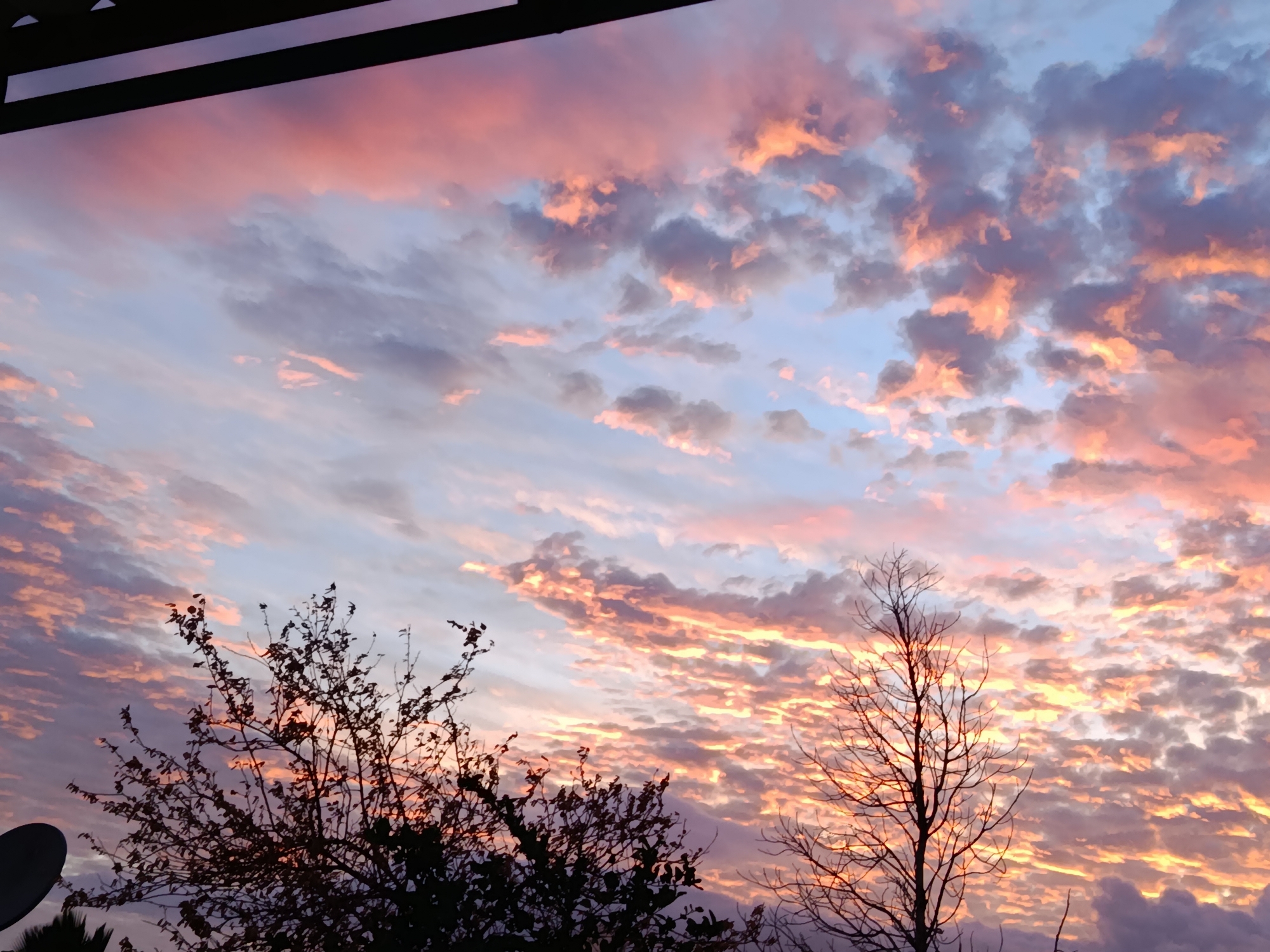 The image captures a vibrant sunset in what is presumed to be Altagracia, Venezuela, based on the prompt. The sky is filled with altocumulus clouds illuminated by the setting sun, creating shades of pink, orange, and light purple against a blue backdrop. Silhouetted in the foreground are the branches of trees, one leafless and another with leaves. A portion of a dark, possibly man-made structure is visible in the upper frame and part of what looks like a satellite dish is visible on the left, partially obscured by the trees. The scene is devoid of people and the only action is the implied setting of the sun and the gentle movement of the clouds.