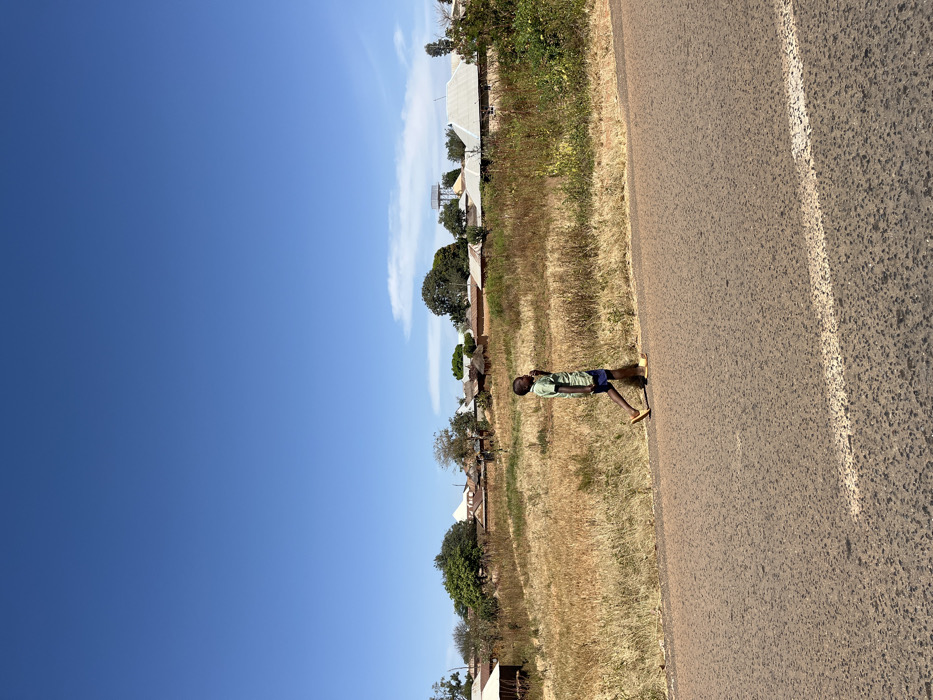 The image depicts a rural or semi-urban outdoor scene in Pankshin, Nigeria, under a clear, bright blue sky with a faint white cloud visible near the horizon on the right. In the foreground, a dark asphalt road, textured with small aggregate, spans horizontally. A faded, broken white line marking is present on the road in the lower right quadrant. Adjacent to the road, on the right side, is a strip of dry, yellowish-brown grass and some sparse green vegetation. Beyond this, a large expanse of dry, straw-colored grass dominates the midground. A single young boy, appearing to be of African descent, is walking from left to right along the edge of the road and the dry grass. He wears a light green collared short-sleeved shirt, dark blue shorts, and yellow open-toed sandals. He is captured mid-stride, with his left leg forward and his left hand near his mouth or chin. His gaze is directed towards the right. In the background, behind the dry field, a cluster of buildings with various roof types—including traditional structures with round, possibly thatched or corrugated iron roofs, and more modern buildings with white or metallic roofs—are visible. Interspersed among these structures are several green trees. A tall metal water tank structure stands prominent on the right side of the background, above the rooftops. The scene is illuminated by bright sunlight, casting subtle shadows.