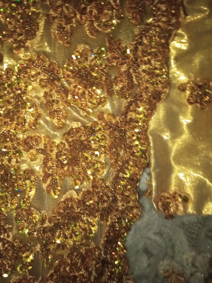 A close-up captures the textures of golden fabric, adorned with intricate floral patterns. Small, shiny beads or sequins add a glittery effect to the design. The base fabric appears somewhat translucent, while another material, possibly lace, can be seen peeking through at the bottom right corner. The overall impression is of rich and elaborate embellishment.