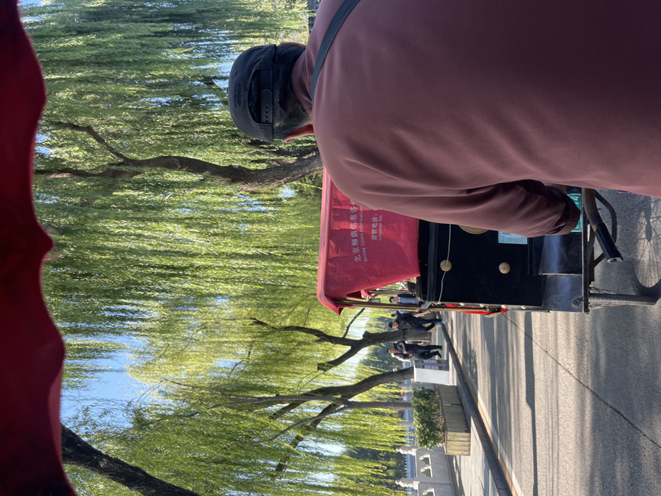 The image depicts an outdoor daytime scene captured from the perspective of a passenger inside a pedicab, looking forward over the driver's shoulder. The location is the Shichahai area in Xicheng District, Beijing, China. **People:** In the immediate foreground, the back of a pedicab driver is visible, wearing a maroon long-sleeved shirt and a black baseball cap. A black strap, likely from a bag, crosses their right shoulder. Further down the road, on the left, several indistinct individuals are walking on a paved pathway. **Objects:** The pedicab itself features a scalloped red fabric canopy partially visible at the top of the frame. The rear of the pedicab's passenger compartment, covered by a red canopy, has a black base adorned with multiple circular brass-colored accents. A sign on the red canopy displays Chinese characters "北京柳荫信息咨询" (Beijing Liuyin Information Consulting) and "投诉电话:" (Complaint Tel:). Parts of the pedicab's handlebars and wheel structure are visible at the bottom. On the left side of the road, a raised curb separates the road from planters containing low green shrubbery. Beyond these, a white stone balustrade, intricately carved in a traditional Chinese style, lines what appears to be a waterway or embankment. **Environment:** The scene is characterized by numerous large willow trees with abundant, vibrant green, drooping leaves, lining both sides of the paved asphalt road and forming a dense canopy overhead. Their dark brown trunks are visible. The sky is clear and bright blue, visible through gaps in the foliage. Bright sunlight casts distinct shadows across the road surface. **Actions:** The pedicab is in motion, being driven forward along the road, while pedestrians are walking on the adjacent path.