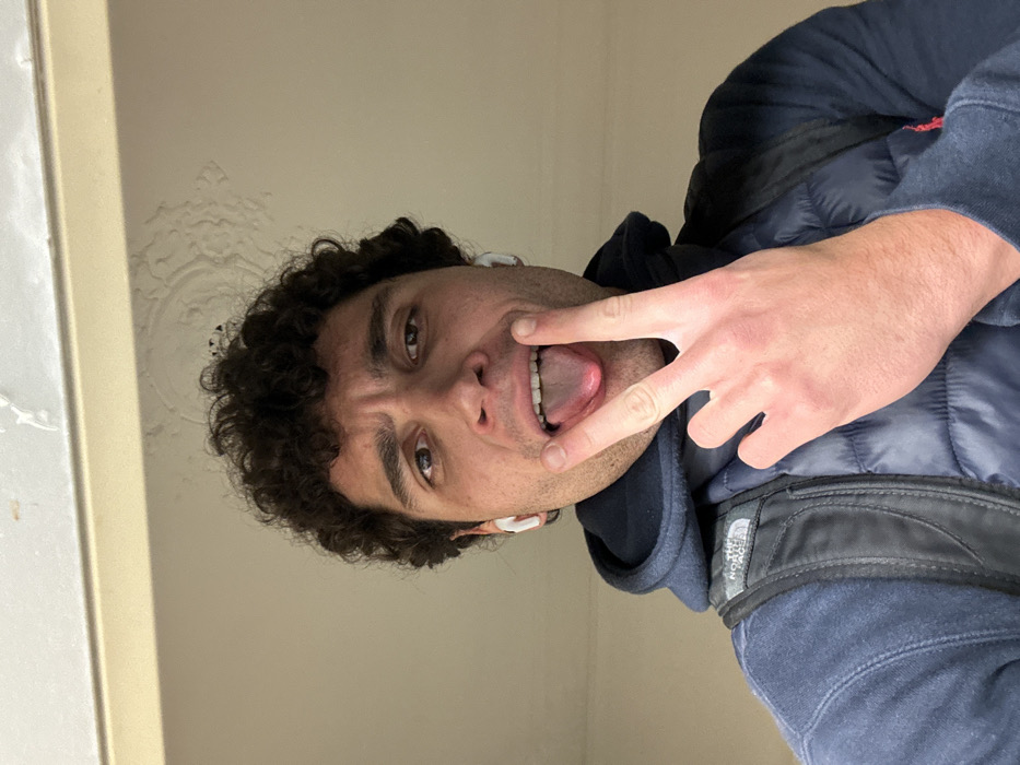 A male individual is depicted in an upward-angled, close-up indoor shot. He has dark, curly hair and brown eyes, and is wearing white wireless earbuds in both ears. His facial expression shows his tongue extended, and his right hand is held up with the index and middle fingers forming a "V" or peace sign. He is dressed in a dark blue hooded sweatshirt under a dark blue or black puffer vest, with a black backpack, featuring a "The North Face" logo, visible on his left shoulder strap. The background consists of a plain, light-colored ceiling or upper wall area, with a beige-colored horizontal trim line visible at the top. Irregular textured patterns, consistent with potential water damage or peeling paint, are visible on the ceiling/wall surface above the individual's head. The specific location within the city of Paris, France, cannot be determined from the provided visual information, as the background elements are generic interior architectural features.