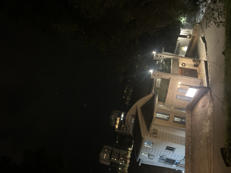 The image depicts a nighttime view of the Jewish Community of Montenegro building, identifiable as a synagogue by the prominent Star of David emblem above its main entrance, located in Podgorica, Montenegro. The central, two-story building features a light-colored, stucco-like facade, a distinctive curved roof, and multiple windows with visible interior lighting. Several external air conditioning units are mounted on its left side. A paved driveway or forecourt leads to the main entrance, bordered by a low, light-colored stone wall. A modern street lamp with a rectangular light fixture illuminates this area. Another, smaller white building is visible further down the driveway to the right, also illuminated. Dark foliage from trees and bushes is present on the right side of the frame and in the immediate foreground, which consists of a dark, unkempt grassy slope. In the background, against a dark night sky, several multi-story buildings with illuminated windows and other distant city lights are visible. The scene is devoid of people.