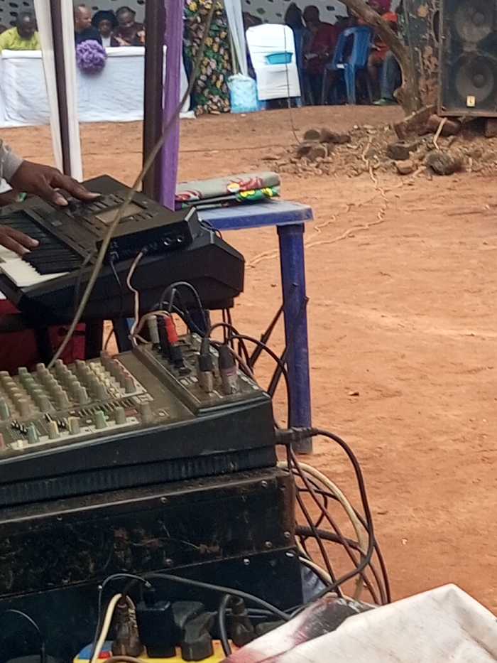 This image depicts an outdoor event in Oko Town, Nigeria, set on red-brown lateritic soil. In the immediate foreground, a person's hands operate a black electronic keyboard (synthesizer) positioned on a stand. Below the keyboard, a multi-channel audio mixing console, heavily cabled, is stacked on top of at least two other black electronic rack units. Various audio cables, including black, white, red, and yellow, are visibly connected to the equipment, some spilling onto the ground. A yellow multi-outlet power strip with multiple plugs is visible in the lower left foreground. To the right of the keyboard, a blue plastic stool holds a folded, patterned fabric item. In the mid-ground and background, an event area is established with white canopies or tents. Under these shelters, multiple individuals are seated on white covered chairs with blue accents and bare blue plastic chairs. Attendees wear various clothing, including traditional garments and head coverings. On the far right, a large dark speaker box rests near the base of a tree trunk. The ground shows scattered debris, including small rocks and dried organic matter. The overall scene suggests a live musical performance or event requiring sound amplification.