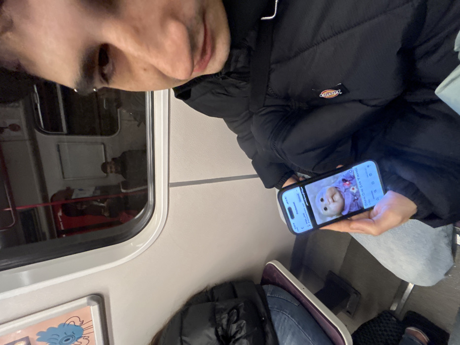 The image depicts the interior of a subway train car in the city of Unknown, Unknown. A male subject is positioned in the foreground, looking directly at the camera. He has dark hair, a prominent nose, and wears a black puffer jacket featuring a small orange-and-white Dickies logo on the left chest. He holds a smartphone in his left hand, its screen displaying an image of a large-eyed doll. The phone's interface shows elements consistent with a social media application, including a profile name "sergi_dgz". To the left of the main subject, another individual is partially visible, seated, wearing blue jeans and a black puffer jacket. Through the train window in the background, reflections show the interior of an adjacent train car, including a seated male with a slight smile and another person standing near a red panel. A white-framed poster depicting a blue cartoon character is visible on the train wall in the upper left. The train car features light-colored panels and purple seating.