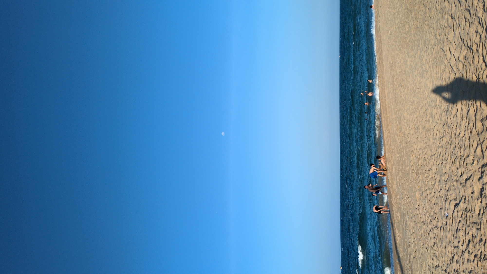 The image depicts a beach scene with the sky taking up approximately half the frame. The sky transitions from a darker blue to a lighter shade. A small, pale circle, possibly the moon, is visible in the lighter blue section. The lower half of the image shows a sandy beach meeting the ocean. People are seen in the water and on the shoreline. The sand displays textured patterns and a shadow of a person, presumably taking the picture, is cast onto it. The water is dark blue with small waves. The location appears to be a beach in Thành phố Tuy Hòa, Vietnam. People are interacting near the water's edge.