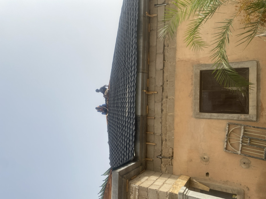 Two people are working on a roof covered in dark gray tiles. The roof is attached to a building under construction with exposed concrete blocks and a stucco wall. A small square window with a dark interior sits in the wall, and a palm tree is partially visible in the top right corner. Wooden planks support the gutter system on the roof's edge.