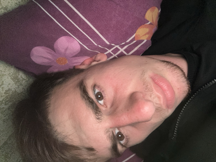 A young adult male is depicted in a close-up, diagonal portrait, appearing to be lying down. He has dark brown hair, dark eyebrows, and brown eyes, looking directly towards the camera. His skin tone is fair, exhibiting some redness on the cheeks and nose. Faint stubble is visible on his chin and upper lip. He is wearing a black garment with a visible zipper closure, indicative of a jacket or sweatshirt. His head rests on a purple pillow featuring a stylized pink flower with an orange center and white horizontal stripes. A light green, textured fabric, possibly another pillow or blanket, is visible in the upper right background. The specific geographic location of Bulishi, Georgia, is not discernible from the visual information presented.