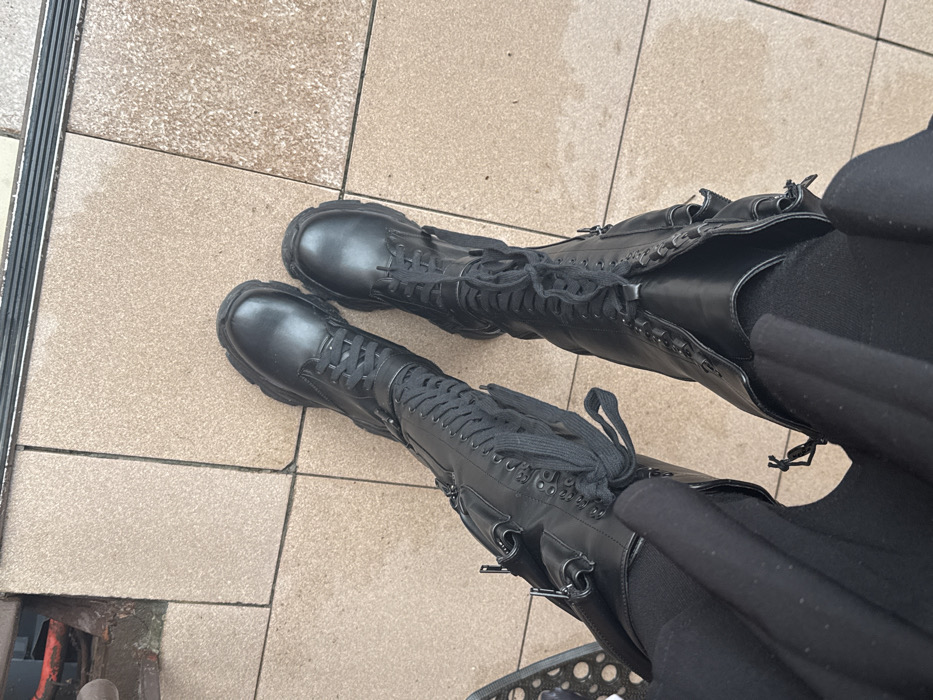 - "A high-angle forensic view captures the lower legs and feet of an individual wearing black knee-high boots and black lower garments" by FM-hXOct2, licensed under CC BY 4.0