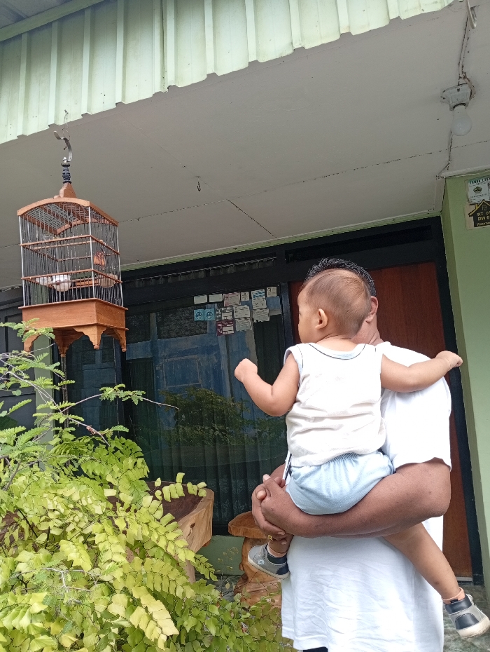 A man in a white shirt holds a toddler facing away from the camera. The child wears a white shirt and blue shorts. A birdcage hangs nearby, with greenery in front of it. A building with light green walls is visible in the background. A light fixture and some sort of informational signage are mounted to the building.