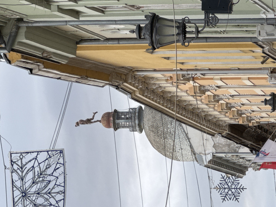 The image presents an urban architectural scene in Novi Sad, Serbia, under an overcast sky. The central focus is the upper portion of a historic building, specifically the Bishop's Palace (Vladičanski dvor) located on Zmaj Jovina street. Perched atop a small, reddish-brown, dome-shaped cupola, which itself crowns a larger, light gray, tiled dome with a cylindrical windowed base, stands a weathered, bronze-colored statue. This statue depicts a lean male figure, likely Mercury, in a dynamic striding or running pose, balanced on one leg, with a winged helmet visible. To the immediate right, the detailed facade of an adjacent building is partially visible, featuring an elaborate decorative cornice and an orange-peach coloration with lighter architectural accents. Further right, another multi-story building displays a yellow facade with vertical light-colored pilasters, and a section of a light green building is present at the far right. A black, ornate street lamp, characteristic of traditional designs, is mounted on a pole in the foreground on the right side. Overhead, numerous thin wires crisscross the frame horizontally. Two illuminated holiday decorations are suspended: a large, rectangular panel with an intricate snowflake design in the upper left quadrant, and a smaller, individual snowflake decoration positioned lower and to the left. At the lower left, segments of two flags are visible: one predominantly red, and another white flag displaying a dark emblem or text. No individuals are present in the scene, which is characterized by static architectural elements and urban infrastructure.