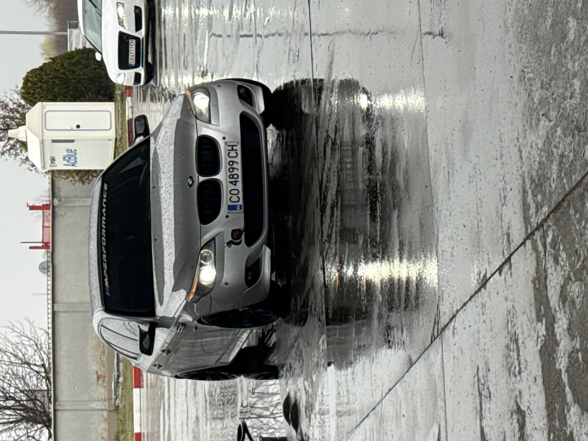 The image depicts an outdoor scene in Gorni Bogrov, Bulgaria, under overcast conditions on a wet, paved surface. A silver BMW 5 Series sedan, model generation E60, is centrally positioned, facing forward with its headlights illuminated. The vehicle's windshield features a black "IMPERFORMANCE" banner, and its front license plate reads "CO 4899 CH". A small, dark-colored decal is affixed to the lower right section of the front bumper. To the right of the BMW, a white Audi sedan is partially visible, displaying the license plate "CO 6711 CH". Both vehicles are reflected in the water covering the foreground pavement. In the background, a low concrete wall spans horizontally. Behind this wall, to the right, a white AdBlue dispensing unit with a visible door stands. A bare deciduous tree is situated behind the wall to the left, while a dense, conical evergreen bush is located to the right of the AdBlue unit. A red and white striped curb marks the left edge of the paved area. No individuals are present in the scene.