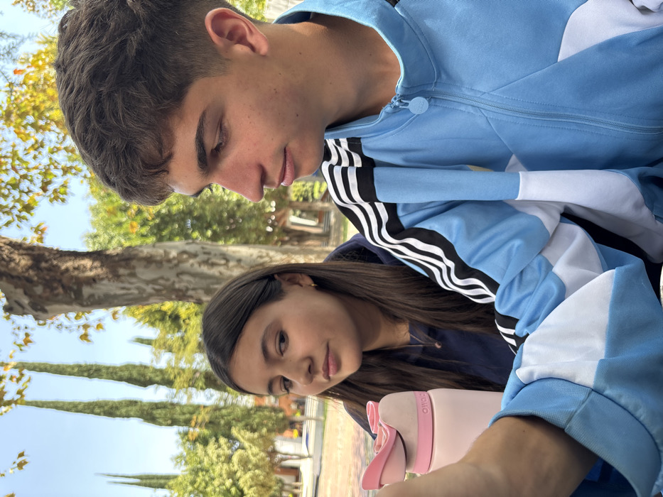 An outdoor scene captured under bright daylight depicts two young individuals seated. The male, positioned in the foreground on the right, appears to be a teenager or young adult with short, dark brown, textured hair and a fair complexion. He wears a light blue, white, and black Adidas track jacket featuring three black stripes on the sleeves and a white vertical stripe on the torso. His gaze is directed forward and slightly downwards, out of frame to the right. A portion of his left arm is visible in the lower left quadrant. The female, also a teenager or young adult, is seated behind and to the left of the male. She has long, straight, dark brown hair and a fair complexion. She wears a dark blue hooded sweatshirt and a small gold hoop earring in her visible left ear, along with a necklace featuring a small, dark pendant. Her face is turned slightly towards the camera, displaying a subtle smirk or knowing expression, with her eyes directed towards the viewer. Between the two individuals, on a surface in front of the female, rests a light pink Owala brand water bottle with a darker pink flip-top lid. The background consists of various trees, indicating a park-like or campus environment. Directly behind the female is a large tree with light-colored, mottled bark and scattered yellow-green leaves. Further back, several tall, slender, dark green coniferous trees are prominent against a clear blue sky. Additional leafy green trees with some yellowing foliage are visible in the middle ground, along with faint outlines of distant light-colored structures and a light-colored paved area to the far left. The scene is illuminated by strong, clear sunlight. The environment suggests a public outdoor space such as a park or educational institution campus within the city of Puebla, Mexico.
