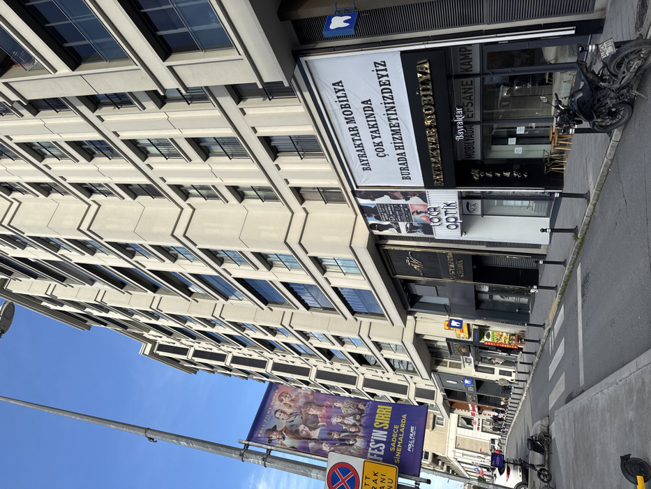 The image depicts an urban street scene in Zeytinburnu, Turkey, under a clear blue sky