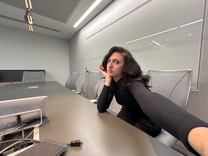 The image depicts a modern office conference room, stated to be located in Garston, United Kingdom. The room features light grey walls and a white ceiling with linear recessed lighting and a gold-colored cylindrical decorative fixture. A single female individual, with dark wavy hair, is positioned in the foreground, taking a selfie. She is wearing a black long-sleeved ribbed top and dark lower garments, with her left hand resting against her jawline. Her expression is neutral as she looks directly at the camera. In the middle ground, a long, dark grey conference table extends from the foreground to the background, surrounded by several light grey office chairs with mesh backs. On the table in the foreground, a white Cisco device, various black and grey cables, and a dark grey rectangular Belkin device are visible. A large glass partition forms part of the back wall, reflecting the overhead lights. Behind the table on the left, a dark credenza or cabinet with a black top is present. The overall environment appears clean, organized, and professionally corporate.