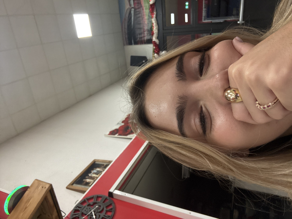 The image depicts a young individual with blonde hair posing indoors, covering their nose and mouth with their right hand in a playful or bashful gesture. The person's eyes are closed or squinted in a smile. Two rings are visible on the right hand: a large, polished gold dome-shaped ring on the thumb and a rose gold band with small red stones on the ring finger. The background reveals a commercial interior with white walls, a red horizontal stripe/panel, and a white ceiling composed of square acoustic tiles with a rectangular fluorescent light fixture. On the left, a wooden shelf holds a green glowing circular object. Below the shelf, a dark, ornate clock with Roman numerals is mounted on the wall. Further right, a framed picture and a partial view of an artwork with red elements are visible. On the right side of the frame, a black wall-mounted speaker is present, and red and white garland decorates what appears to be a doorway or window. Beyond this, a blurred image of a stadium's seating area is discernable. Based on the distinct stadium backdrop and the specified location, this scene is situated within or adjacent to a venue associated with the **Parc Olympique Lyonnais (Groupama Stadium)** in Décines-Charpieu, France, likely a concession stand, restaurant, or lounge area within the stadium complex or nearby.