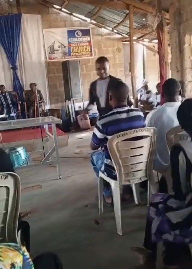 The scene depicts an event taking place inside what appears to be a church. The space is relatively simple, with a corrugated metal roof and brick walls. A banner is visible on one of the walls, displaying the text "ECWA CHURCH 2023 TARGET CHURCH". People are seated on plastic chairs, some of which have the label "ECWA CHURC" printed on them. A man, dressed in a dark-colored suit with white accents, walks briskly through the rows of chairs, causing the chairs to move slightly. The reaction of the seated individuals varies, with some looking up, others turning to observe the movement, and one person appearing to clap. A group of musicians is visible on the left side of the frame, seated behind a table, seemingly observing the activity.
