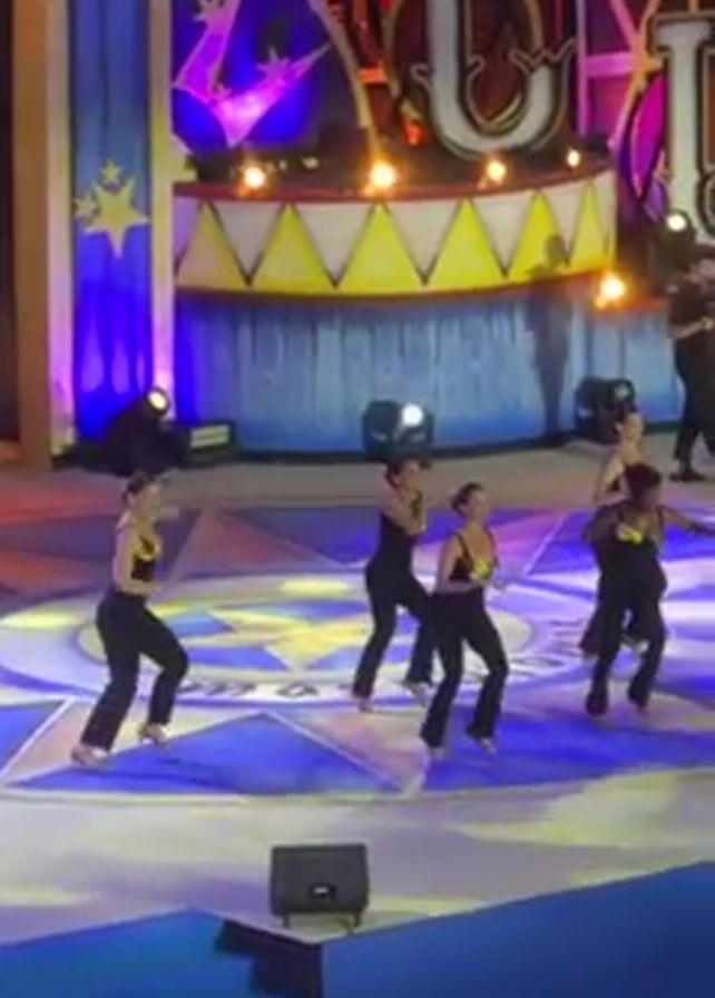 Several women in black outfits dance on a circular stage with a geometric pattern, illuminated with blue and white lights. Behind them is a large stage prop resembling a circus tent with the letters "CUJ" displayed prominently. A person in a black uniform and hat stands near the dancers, observing. The stage is bordered by blue steps. The background includes additional circus-themed decorations.