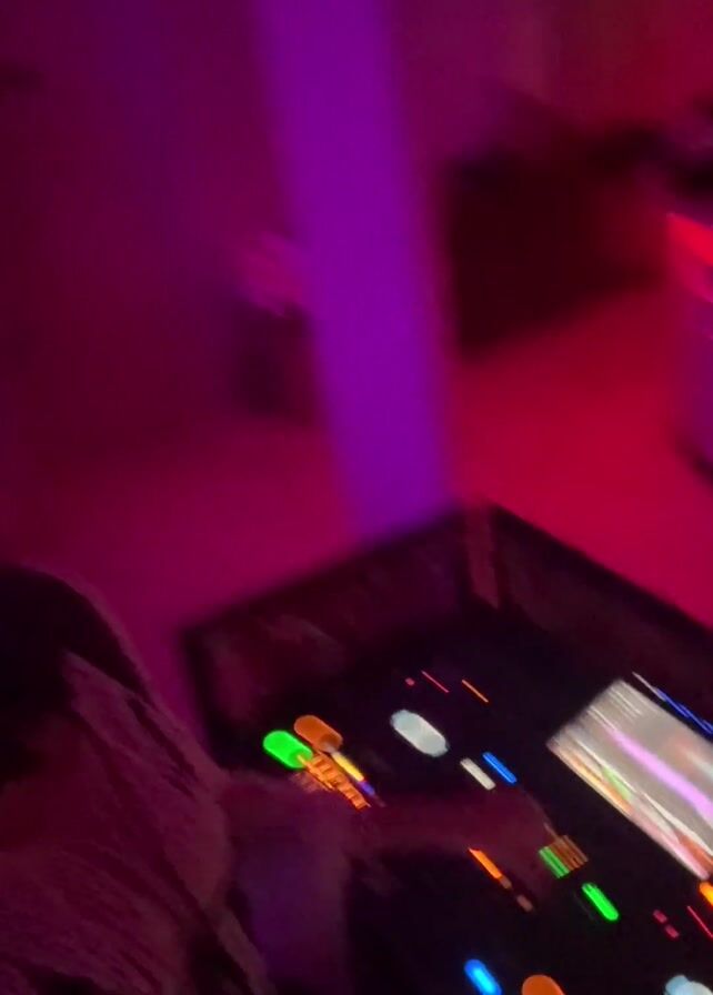 A woman is operating a DJ console in a room with colorful lighting. The lighting shifts from red and pink to purple and blue. The woman is wearing a white crochet top, a black backpack, and a black neck scarf. She is facing the camera and then turns to the DJ console, manipulating the controls. The room appears to be a nightclub or lounge setting. The DJ console features a screen and illuminated buttons.