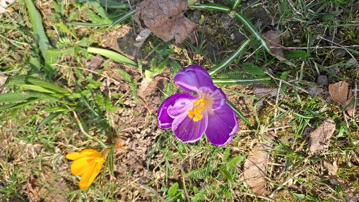 The scene displays a close-up, ground-level view of an outdoor natural environment in Pilsen, Czechia, illuminated by direct sunlight. A vibrant purple crocus flower, fully open with visible yellow anthers and stigmas, occupies the lower right-center of the frame. In the upper left quadrant, a yellow crocus flower is partially visible. The ground consists of sparse green grass, patches of bare brown soil, scattered dry brown leaves from deciduous trees, and small areas of moss. No individuals, animals, or man-made objects are present.