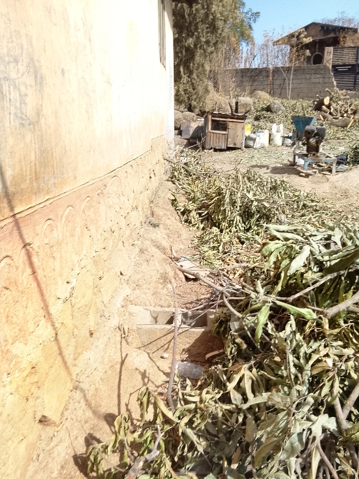 The image depicts an outdoor scene in Jos, Nigeria, adjacent to a building. The left foreground is dominated by a light-colored, stuccoed wall with a repeating arched relief pattern along its base. An earthen embankment slopes downwards from the wall, partially revealing two concrete steps. The ground to the right and center-foreground is covered with an extensive accumulation of dried branches and leaves. In the mid-ground, a small, corrugated metal and wooden shack is visible. To its right, several white sacks rest on the ground, beside which a piece of industrial machinery, likely a grinder or mill with an engine and hopper, is positioned on a metal stand. Further right, a pile of cut logs and branches is stacked. The background features sparse, dry vegetation, a concrete perimeter wall, and the partial view of another building under a clear blue sky. No individuals are present in the scene.